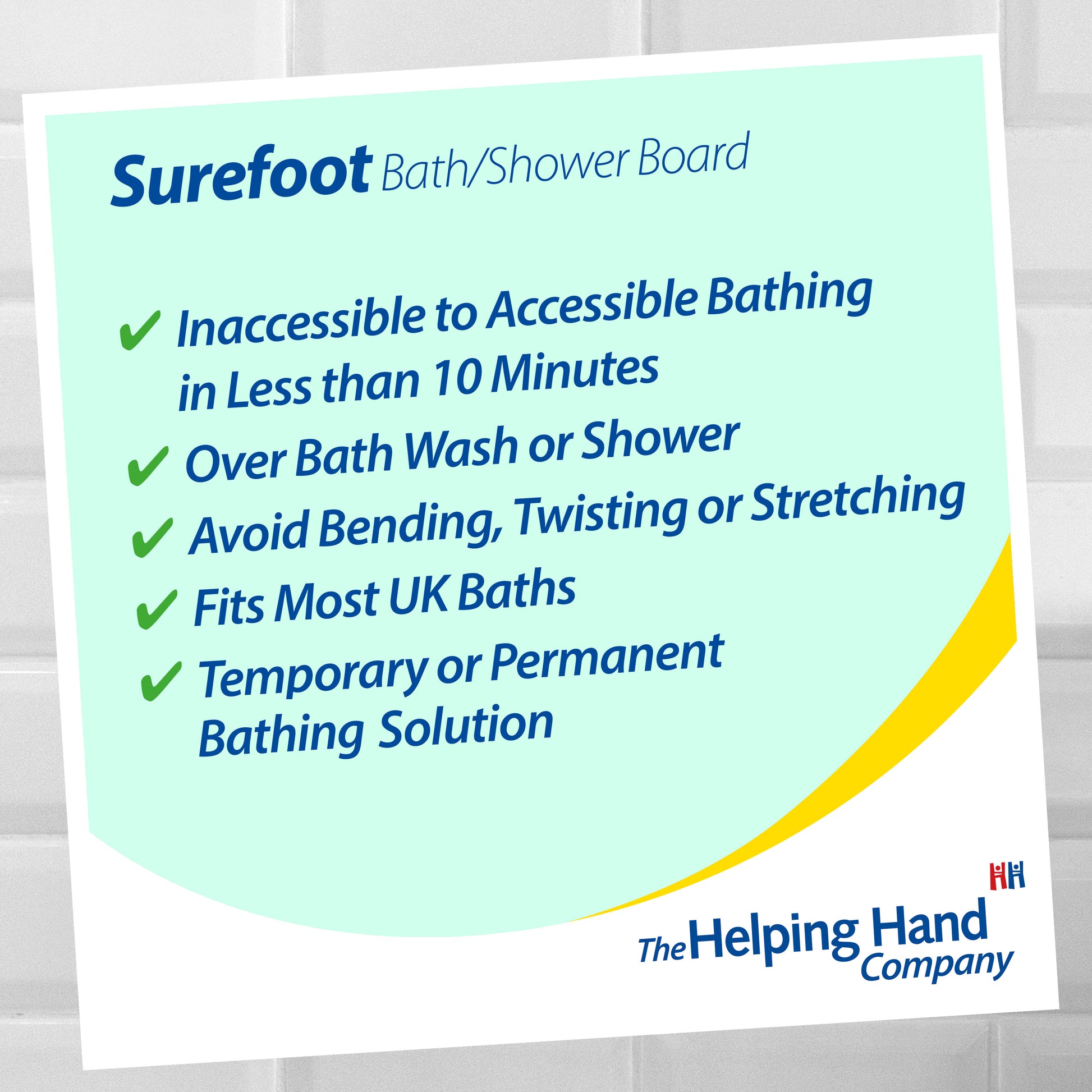 - Strong and comfortable. The Surefoot white bath board is slip resistant and has an optional safety handle, giving added stability when transferring and while seated. The slatted board allows for quick water drainage. Weight limit of up to 200kg/31 stone.