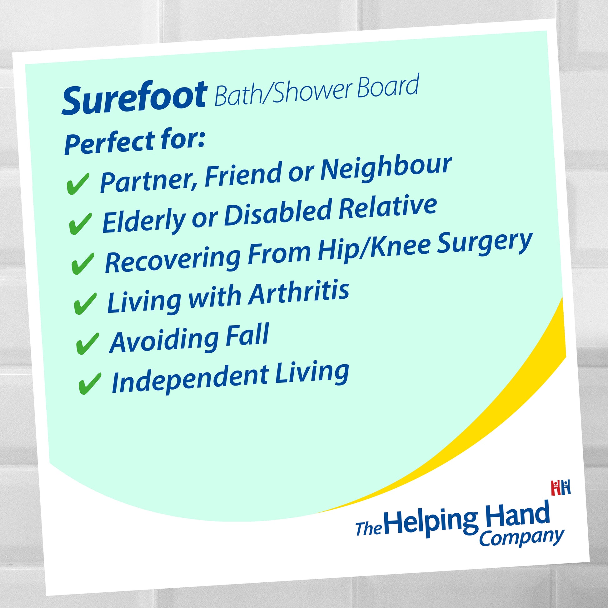 Easy to install and maintain. Our Surefoot® bath shower board is simple to assemble and fix in 4 steps – no tools required. The optional safety handle gives extra stability when changing position. Reassuringly by your side every time you wash. The bath board seat is for use by the elderly or less mobile. If you are no longer able to safely climb in/out of the bath, you have reduced mobility or reduced strength to safely transfer, and you have the ability to sit unsupported/unaided. Because of this the bath board is not suitable for users who are unable to sit without support.